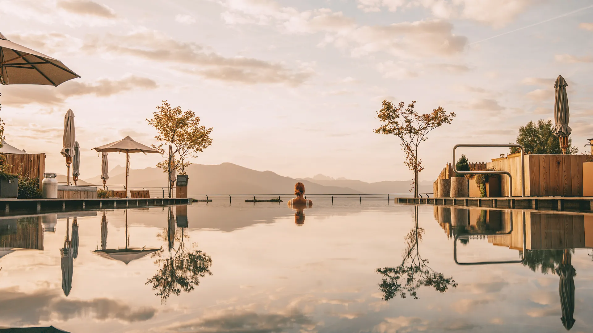 Afloat, feeling light and free. The horizon so close you can almost touch it. Dipping into our panoramic infinity pool is so wonderfully invigorating. Purely being, immersed in powerful mountain spring water. A gift that reaches deep within. Boundaries melt away as the view of the Dolomites opens up into infinity. And the play of light turns the sky into a natural cinema. 1,400 metres above the daily grind.