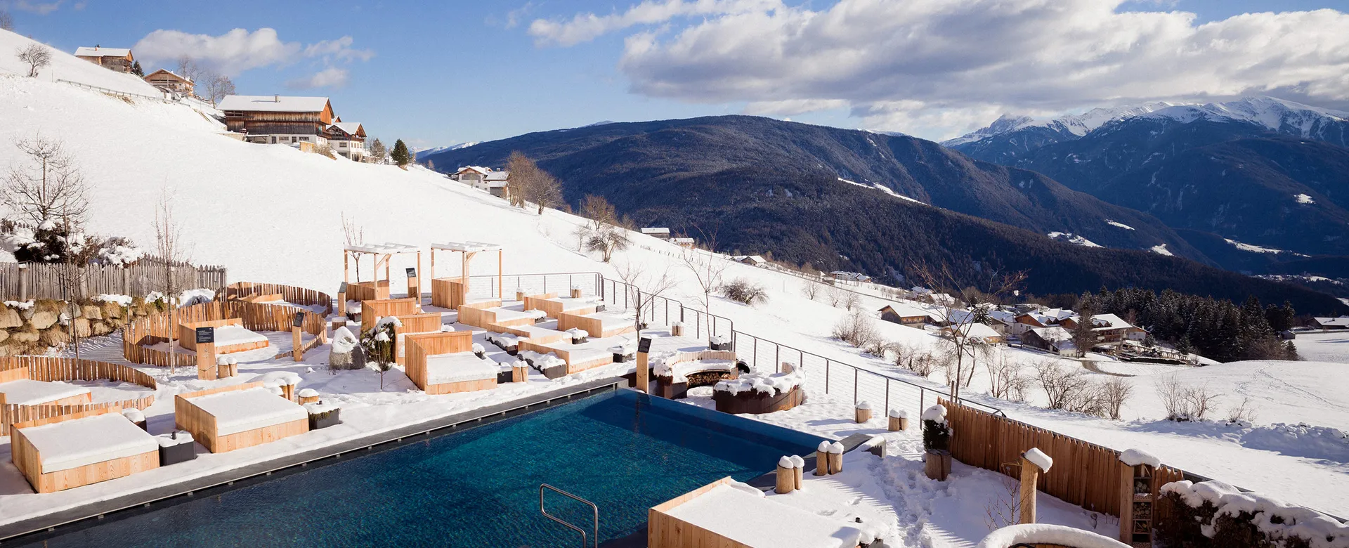 Un sogno di leggerezza e libertà, cullati dall’acqua e incantati dalla vista. Merito dell’acqua di sorgente alpina in cui si nuota, purissima e rinvigorente. E della visuale che si spalanca sulle Dolomiti, pinnacoli chiari che disegnano l’orizzonte. I confini si dissolvono, il cielo diventa spettacolo. Quassù, nel vostro hotel a Maranza, con una piscina a 1.400 metri sopra la quotidianità.